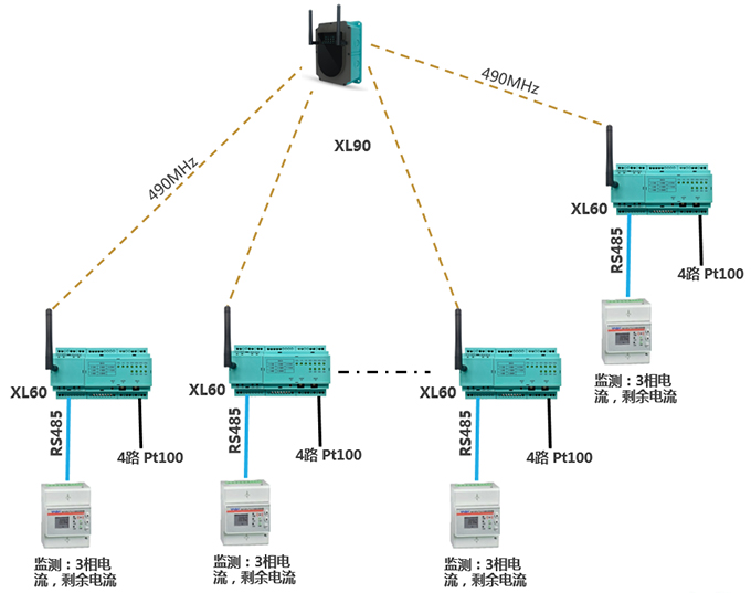 配置1臺XL60智能采集裝置,通過AI模塊采集4只溫度探頭信號,通過RS485讀取電氣監(jiān)測儀表數(shù)據(jù);XL60通過無線上傳采集的電氣、溫度數(shù)據(jù)至XL90物聯(lián)網(wǎng)關