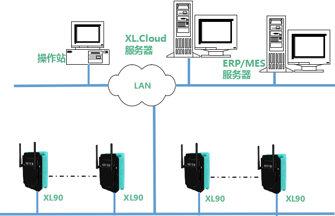 平臺系統(tǒng)的通信網絡,由XL90物聯(lián)網關,企業(yè)局域網,和監(jiān)控服務器構成。