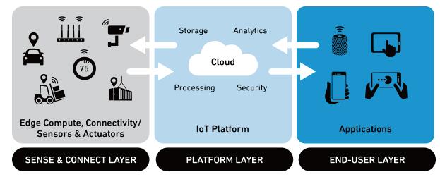 物聯(lián)網(wǎng)大致分為3 層。第1 層為感知和連接層,用于將物聯(lián)網(wǎng)硬件連接到執(zhí)行數(shù)據(jù)處理和存儲(chǔ)的網(wǎng)絡(luò)應(yīng)用。第2 層為平臺(tái)層,用于保護(hù)、處理、分析和存儲(chǔ)數(shù)據(jù)。第3層為最終用戶(hù)層,最終用戶(hù)在此使用應(yīng)用監(jiān)控并解讀數(shù)據(jù)。此外,最終用戶(hù)還可以使用應(yīng)用發(fā)送指令。