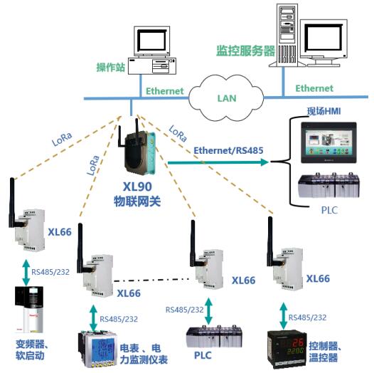 選擇 XL66 串口無(wú)線轉(zhuǎn)換器 ,接入控制儀表、變頻器等設(shè)備的 RS485/232 接口,讀取所需數(shù)據(jù),無(wú)線傳輸至網(wǎng)關(guān)節(jié)點(diǎn)。選擇 XL90 物聯(lián)網(wǎng)關(guān) ,作為無(wú)線接收端,轉(zhuǎn)發(fā)數(shù)據(jù)。