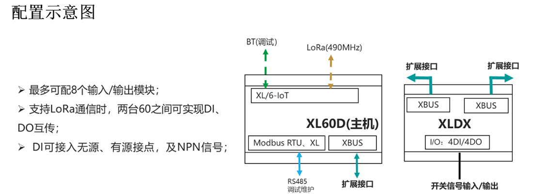 XL60D的通信方式是LoRa無(wú)線傳輸方式,每臺(tái)XL60D主機(jī)模塊,最多配兩個(gè)開(kāi)關(guān)量I/O模塊。