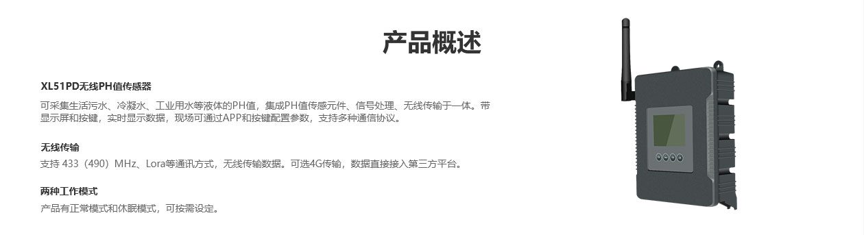 XL51PD無線PH值傳感器,可采集生活污水、冷凝水、工業(yè)用水等液體的PH值,集成PH值傳感元件、信號(hào)處理、無線傳輸于一體。帶顯示屏和按鍵,實(shí)時(shí)顯示數(shù)據(jù),現(xiàn)場(chǎng)可通過APP和按鍵配置參數(shù),支持多種通信協(xié)議。
