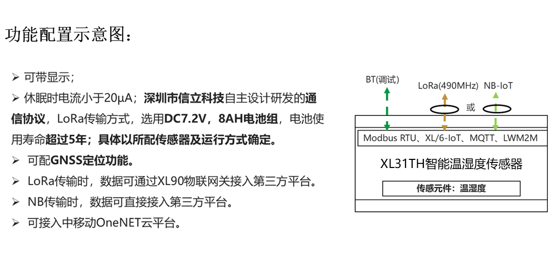 XL31TH智能溫濕度傳感器,集成傳感元件、信息處理、無線通訊、電池供電等于一體。通訊中斷保存數(shù)據(jù),通訊恢復重傳數(shù)據(jù),超限主動上傳數(shù)據(jù),電池能量低上傳報警數(shù)據(jù)。