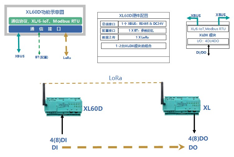 XL60D的通信方式是LoRa無線傳輸方式,每臺XL60D主機模塊,最多配兩個開關(guān)量I/O模塊。
