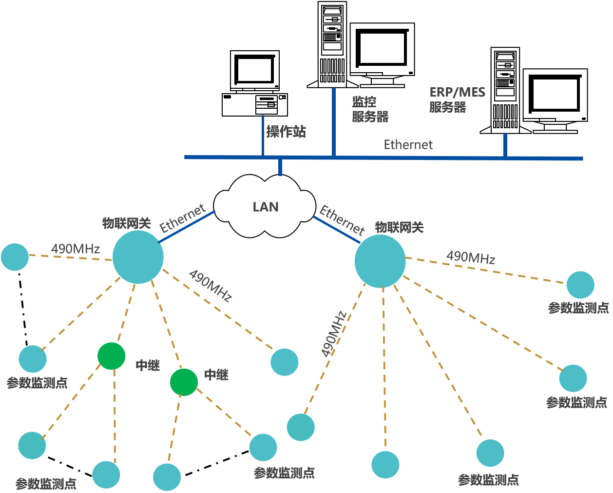 系統(tǒng)網(wǎng)絡(luò)方案一,用于工廠,或規(guī)模較小的園區(qū),水、汽、氣管網(wǎng)監(jiān)測系統(tǒng)。由監(jiān)測節(jié)點、網(wǎng)關(guān)和平臺軟件構(gòu)成