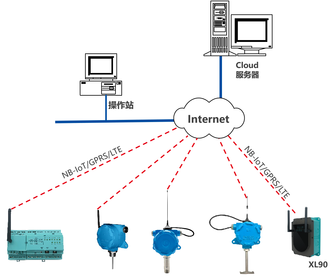類似泵房、水廠、水源井等場所的數(shù)據(jù)監(jiān)測,監(jiān)測點的數(shù)據(jù)先上傳至XL90物聯(lián)網(wǎng)關(guān),再通過NB/GPRS/LTE轉(zhuǎn)發(fā)數(shù)據(jù)至云平臺,此種情況,數(shù)以后在量大時,可選LTE(4g)方式