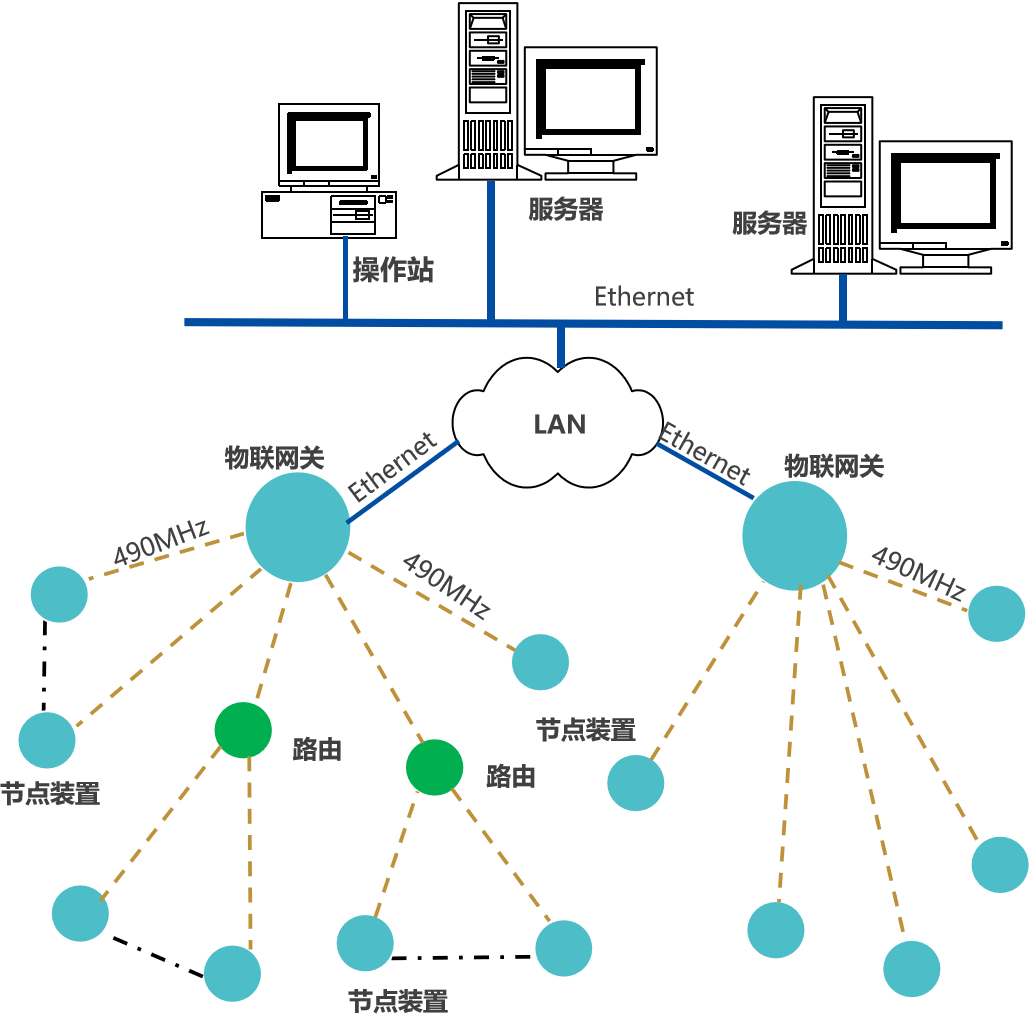 節(jié)點(diǎn)裝置(智能轉(zhuǎn)換器/智能轉(zhuǎn)換裝置),通過490MHz上傳數(shù)據(jù)至物聯(lián)網(wǎng)關(guān),網(wǎng)關(guān)通過Ethernet接入企業(yè)內(nèi)部LAN,推送設(shè)備生產(chǎn)數(shù)據(jù),至企業(yè)生產(chǎn)監(jiān)控平臺