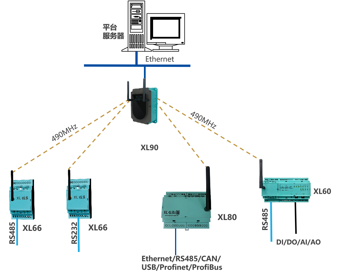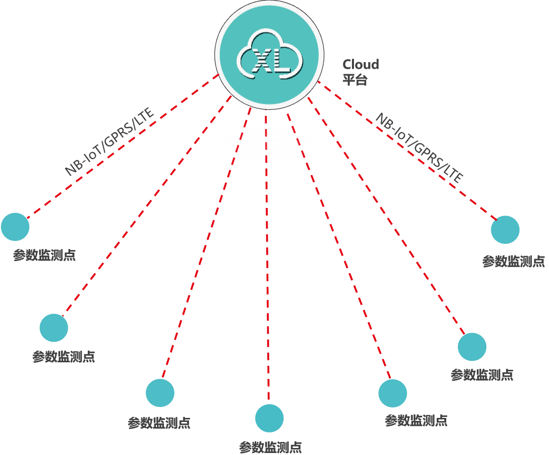 類似泵房、水廠、水源井等場所的數(shù)據(jù)監(jiān)測,監(jiān)測點(diǎn)的數(shù)據(jù)先上傳至XL90物聯(lián)網(wǎng)關(guān),再通過NB/GPRS/LTE轉(zhuǎn)發(fā)數(shù)據(jù)至云平臺,此種情況,數(shù)以后在量大時(shí),可選LTE(4g)方式