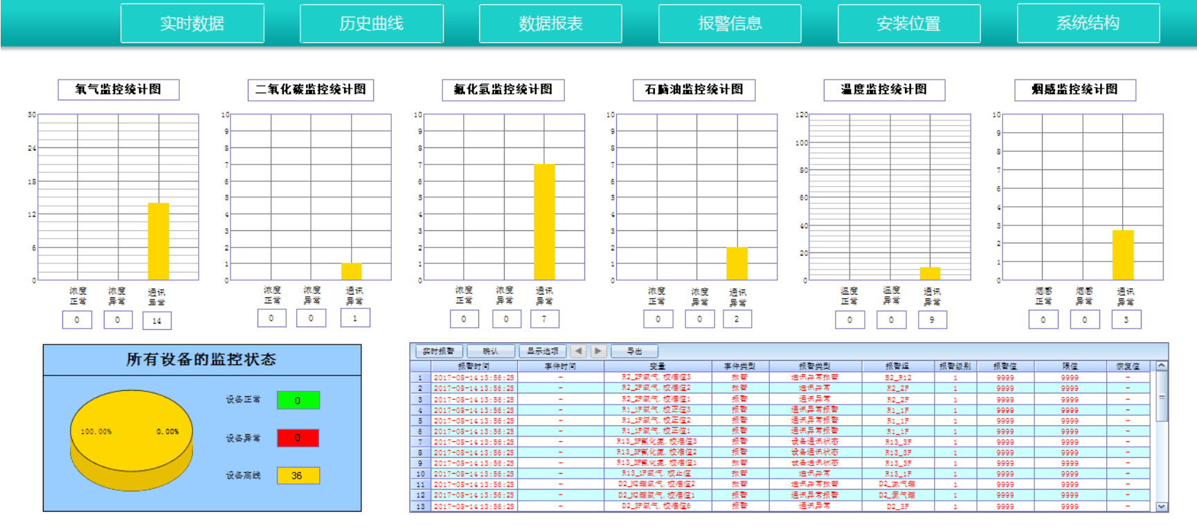 異常情況發(fā)生,如溫度突變,氣體泄漏等等,就地聲光報(bào)警,顯示報(bào)警信息;