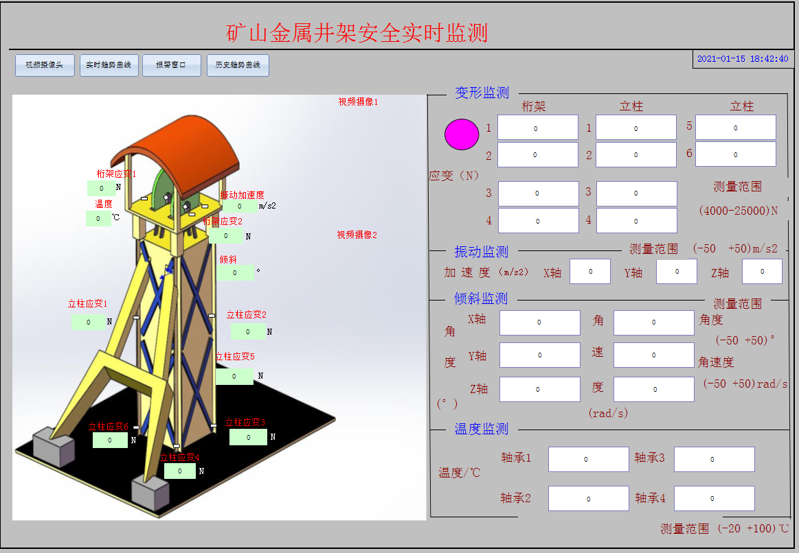 基于XIoT技術(shù)的煤礦井架安全實(shí)時(shí)監(jiān)測(cè)系統(tǒng),實(shí)時(shí)監(jiān)測(cè)井架環(huán)境參數(shù)。當(dāng)參數(shù)異常或出現(xiàn)險(xiǎn)情時(shí),中控室發(fā)出報(bào)警聲提醒工作人員。 1)需提供攝像頭實(shí)時(shí)監(jiān)測(cè)井架周邊情況 ; 2)實(shí)時(shí)監(jiān)測(cè)井架受力情況、振動(dòng)情況、傾斜情況及軸承溫度情況; 3)PC界面可實(shí)時(shí)查看數(shù)據(jù)信息,數(shù)據(jù)存儲(chǔ)不少于180天。監(jiān)控系統(tǒng)簡(jiǎn)述: