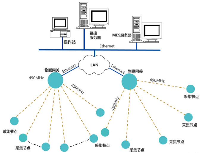 采集節(jié)點,通過490MHz無線上傳數(shù)據(jù)至物聯(lián)網(wǎng)關,網(wǎng)關通過Ethernet,接入LAN,推送數(shù)據(jù)至MES服務器