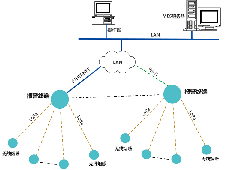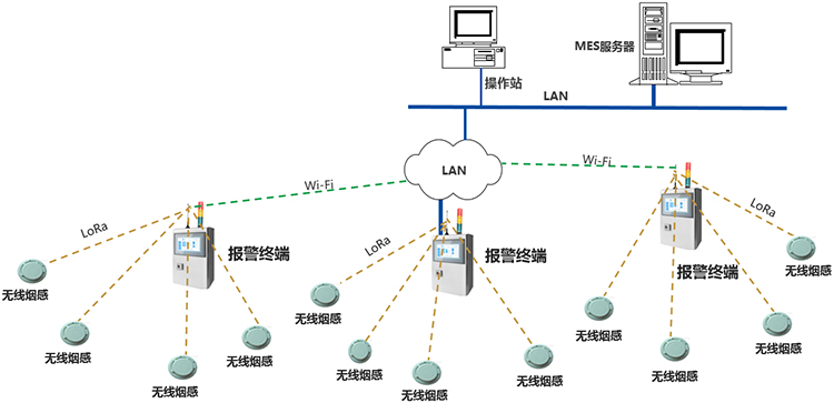報警終端通過無線,獲取管轄區(qū)域內(nèi),煙感監(jiān)測點的數(shù)據(jù),通過ETHERNET,或Wi-Fi,推送數(shù)據(jù)至工廠MES服務器,通信協(xié)議為工廠MQTT數(shù)據(jù)格式。