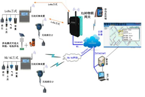 2、傳輸層:傳輸層主要有無線采集裝置、NB、4G、Lora、433MHZ無線傳輸網(wǎng)絡(luò)組成。