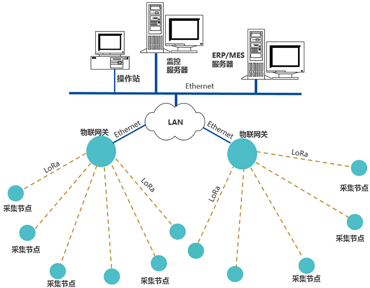 采集點裝置,通過LoRa無線通訊上傳數(shù)據(jù)至物聯(lián)網(wǎng)關,網(wǎng)關通過Ethernet或Wi-Fi,接入LAN,推送數(shù)據(jù)至企業(yè)生產(chǎn)管控服務器。LoRa無線通信網(wǎng)絡技術參數(shù):