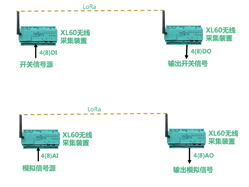 選擇兩臺XL60無線采集裝置,以一對一的無線傳輸方式,實(shí)現(xiàn)模擬、開關(guān)信號無線傳輸:一臺XL60可配置多個I/O模塊;