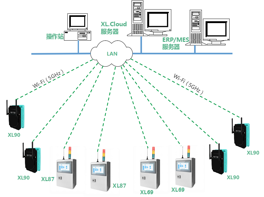 平臺系統(tǒng)的通信網絡,由XL90物聯(lián)網關,企業(yè)局域網,和監(jiān)控服務器構成。
