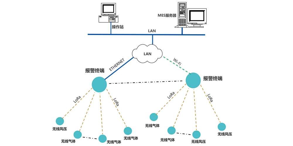 報(bào)警終端無線讀取監(jiān)測(cè)點(diǎn)上傳的數(shù)據(jù),進(jìn)行處理、顯示、報(bào)警;并將數(shù)據(jù)通過局域網(wǎng),MQTT協(xié)議,上傳至MES。