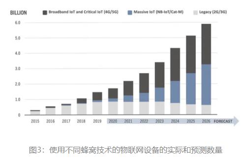 圖3:使用不同蜂窩技術(shù)的物聯(lián)網(wǎng)設(shè)備的實際和預(yù)測數(shù)量
