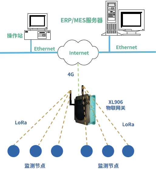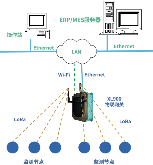 XL906物聯(lián)網(wǎng)關(guān),無(wú)線讀取監(jiān)測(cè)節(jié)點(diǎn)的數(shù)據(jù),進(jìn)行處理、協(xié)議轉(zhuǎn)換,通過(guò)以太網(wǎng)(Ethernet)或Wi-Fi,轉(zhuǎn)發(fā)數(shù)據(jù)至MES、ERP、EMS等多個(gè)工廠數(shù)字化平臺(tái),實(shí)現(xiàn)數(shù)據(jù)聯(lián)網(wǎng)、集中監(jiān)控分析。