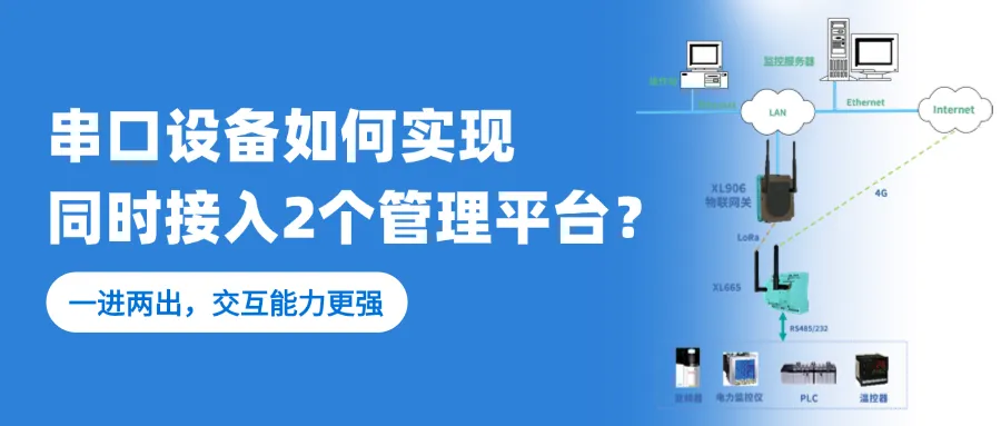 只配置有一個(gè)RS485通信口的設(shè)備,輸出的RS485信號(hào)接入XL665多路通信模塊,轉(zhuǎn)一路LoRa信號(hào)和一路4G信號(hào)輸出,同時(shí)接入現(xiàn)場(chǎng)控制中心和云平臺(tái),實(shí)現(xiàn)設(shè)備數(shù)據(jù)同時(shí)接入兩個(gè)不同的管理平臺(tái)。