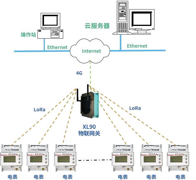 DTSD3366XL無(wú)線(xiàn)多功能電表獲取數(shù)據(jù),通過(guò)LoRa無(wú)線(xiàn)傳輸方式上傳至XL90網(wǎng)關(guān);XL90網(wǎng)關(guān)計(jì)算分析讀取的能耗數(shù)據(jù),并通過(guò)4G無(wú)線(xiàn)通信方式,將數(shù)據(jù)上傳至監(jiān)控平臺(tái)。