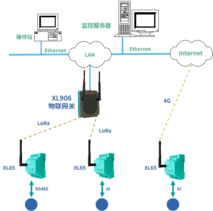 LoRa通信:適合多個(gè)監(jiān)測點(diǎn)處于相對(duì)集中的區(qū)域范圍內(nèi),監(jiān)測點(diǎn)數(shù)據(jù)通過LoRa上傳至XL90物聯(lián)網(wǎng)關(guān),網(wǎng)關(guān)通過Ethernet、WiFi、4G等通信方式上傳數(shù)據(jù)至監(jiān)控平臺(tái);
