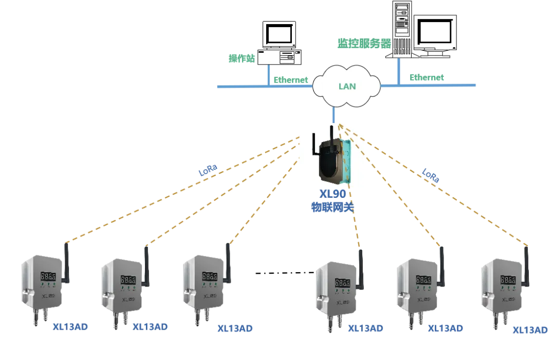 XL13AD無線壓差傳感器通過LoRa無線傳輸數(shù)據(jù)至XL906物聯(lián)網(wǎng)關(guān),網(wǎng)關(guān)可選Ethernet、Wi-Fi、4G等多種方式將壓差數(shù)據(jù)傳輸至監(jiān)控平臺,實現(xiàn)遠程監(jiān)測。